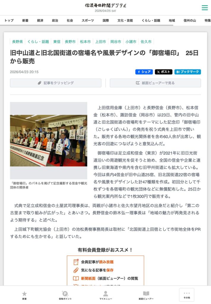 この度、弊社が上田城下町観光協会様と共同で企画し、足立成和信用金庫様にご提案を続けてまいりました北国街道の御宿場印が、2026年4月25日より正式に販売開始される運びとなりました。