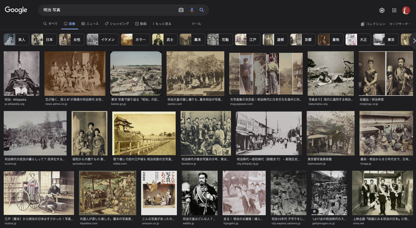 ちなみに、Google画像検索で「明治 写真」などのキーワードで出力される写真資料の多くは明治40年以降、大正初期ごろのものがほとんどです。