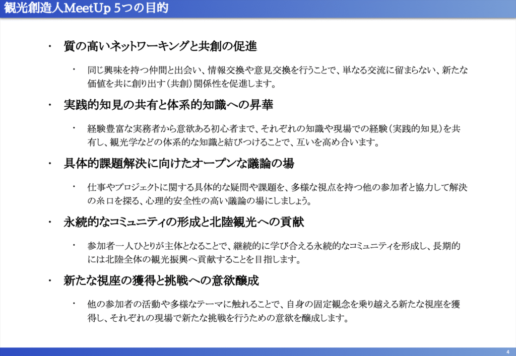 (一財)地域振興研究所と連携し、地域の観光課題に取り組むための継続的な勉強会を主催。毎月第3水曜日、元JAIST(北陸先端科学技術大学院大学)の敷田教授をはじめ、多様なプロフェッショナルが集い、未来の石川の観光を担う人材ネットワークと、課題解決の体制を構築しています。