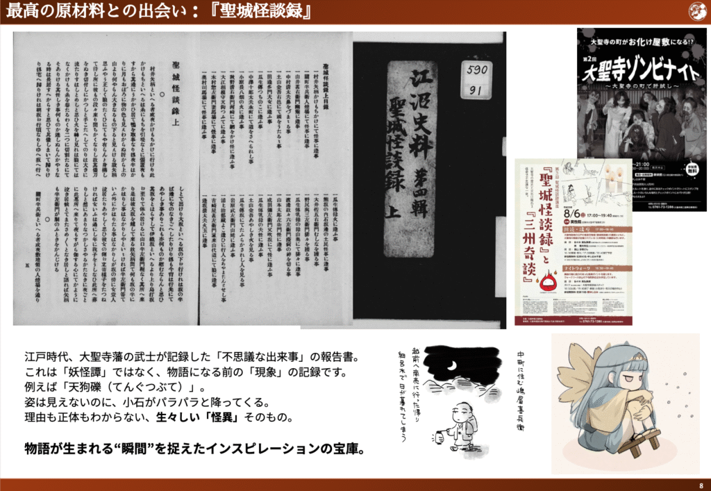 地域に伝わる「聖城怪談録」という物語資源を怪談ではなく、江戸時代の民俗学資料として再構築。
